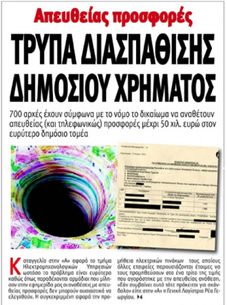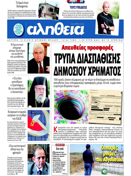 Με τίτλο «Τρύπα διασπάθισης δημόσιου χρήματος», η «Αλήθεια» στο κύριό της θέμα γράφει ότι υπάρχει ευρύτερο πρόβλημα με τις απευθείας προσφορές, προβάλλοντας συγκεκριμένη καταγγελία στην εφημερίδα για προσφορά που αφορά το Τμήμα Ηλεκτρομηχανολογικών Υπηρεσιών. Αλλού γράφει ότι η Ερευνητική Επιτροπή για την οικονομία απέρριψε αίτημα του Δημήτρη Χριστόφια για αναβολή της κατάθεσής του ώστε να προετοιμαστεί καλύτερα. Αναφέρεται επίσης και σε κατά μέτωπο επίθεση του Αρχιεπισκόπου Χρυσοστόμου στον Πανίκο Δημητριάδη για το ρόλο του στις εξελίξεις στον τραπεζικό τομέα.