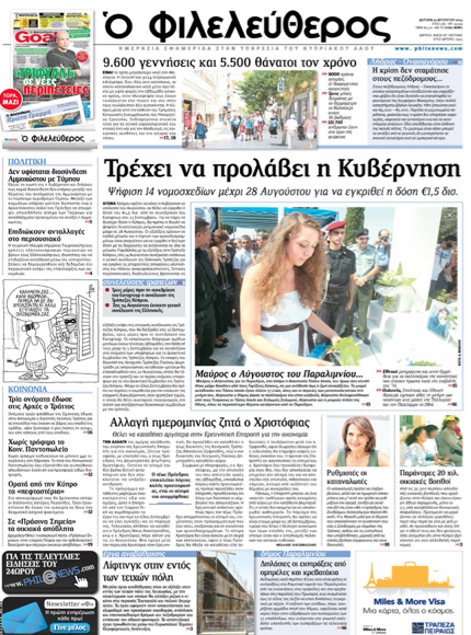 «Τρέχει να προλάβει η Κυβέρνηση» είναι το κύριο πρωτοσέλιδο θέμα της εφημερίδας ο «Φιλελεύθερος», που γράφει ότι οι εξελίξεις τρέχουν σε πολλά μέτωπα και η τήρηση των χρονοδιαγραμμάτων είναι απαραίτητη για να εγκριθεί η δεύτερη δόση από το Eurogroup, με την Τράπεζα Κύπρου να έχει τη Συνέλευσή της τρεις μέρες πριν τη συνεδρίαση του και την Ελληνική να έχει έκτακτη Γενική Συνέλευση στις 14 Αυγούστου. Αλλού γράφει για ενδιαφέροντα στατιστικά στοιχεία από την έκθεση του Τμήματος Κοινωνικής Ενσωμάτωσης του Υπουργείου Εργασίας όπως ότι σημειώνονται 9.600 γεννήσεις και 5.500 θάνατοι το χρόνο. Σε άλλο πρωτοσέλιδο θέμα, και προβάλλοντας σχετική φωτογραφία με την κόρη του χθες σε μνημόσυνο, αναφέρεται στον Τάσο Ισαάκ και τον Σολωμό Σολωμού.