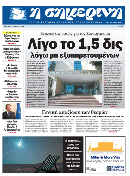 «Κούρσα ενάντια στο χρόνο» είναι ο κύριος πρωτοσέλιδος τίτλος της αγγλόγλωσσης «The Cyprus Daily», η οποία γράφει ότι η Κυβέρνηση είναι αντιμέτωπη με μια κούρσα ενάντια στο χρόνο έτσι ώστε να διασφαλίσει ότι το Eurogroup θα εγκρίνει το απαιτούμενο €1,5 δισ. του πακέτου διάσωσης στις 13 Σεπτεμβρίου και ότι η Βουλή πρέπει να εγκρίνει 14 μνημονιακά νομοσχέδια πριν τις 29 Αυγούστου. Αλλού και προβάλλοντας σχετική φωτογραφία γράφει για την πορεία των μοτοσικλετιστών χθες στο Παραλίμνι εις μνήμη των Τάσου Ισαάκ και Σολωμού Σολωμού. Σε άλλο πρωτοσέλιδο θέμα γράφει ότι η Αστυνομία προειδοποίησε χθες ότι πρέπει να ειδοποιείται για όλους τους ποδοσφαιρικούς αγώνες μετά και επίθεση εναντίον διαιτητή από φιλάθλους σε φιλικό αγώνα μεταξύ Άρη και Ομόνοιας, στη Λεμεσό.