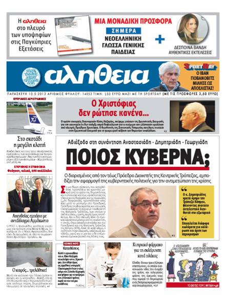 Η «Αλήθεια», τιτλοφορεί το κύριο θέμα της «Ποιος κυβερνά;», και γράφει ότι ο διορισμένος από τον τέως Πρόεδρο, Διοικητής της Κεντρικής Τράπεζας, «εμποδίζει την εφαρμογή της κυβερνητικής πολιτικής για την αντιμετώπιση της κρίσης» και σημειώνει ότι υπήρξε αδιέξοδο στη συνάντησή του με τον Πρόεδρο της Δημοκρατίας και τον Υπουργό Οικονομικών χθες. Αλλού αναφέρει ότι ο πρώην ΥΠΟΙΚ Κίκης Καζαμίας δήλωσε ενώπιον της Ερευνητικής Επιτροπής για την οικονομία ότι δεν υπήρξε καμία διαβούλευση για το κούρεμα των ελληνικών ομολόγων από πλευράς Δημήτρη Χριστόφια. Γράφει επίσης ότι τρεις Κύπριοι επιστήμονες ανακοίνωσαν την τελευταία φάση της έρευνας που αφορά φάρμακο κατά της σκλήρυνσης κατά πλάκας.