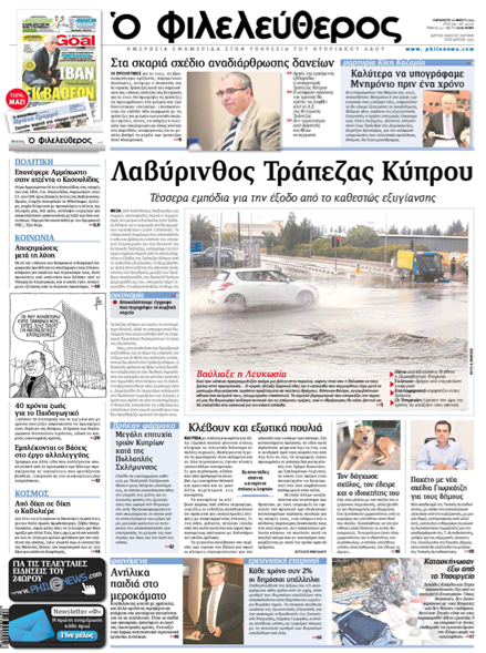 «Ο Φιλελεύθερος», κάτω από τον πρωτοσέλιδο τίτλο «Λαβύρινθος Τράπεζας Κύπρου», γράφει ότι μέσα από πολύπλοκες διαδικασίες και νομικές σχοινοβασίες περνά ο τερματισμός των μέτρων εξυγίανσης στην Τράπεζα Κύπρου και ο χειρισμός των δεσμευμένων καταθέσεων. Προβάλλει επίσης δηλώσεις του Διοικητή της ΚΤΚ Πανίκου Δημητριάδη ότι οι προοπτικές για το 2013, σε βραχυπρόθεσμο ορίζοντα, παραμένουν δυσοίωνες, προσθέτοντας ότι θα προτρέψει τις τράπεζες να μειώσουν τα δανειστικά επιτόκια. Γράφει επίσης ότι σύμφωνα με τον πρώην Υπουργό Οικονομικών Κίκη Καζαμία, θα ήταν καλύτερο να υπογράφαμε το μνημόνιο το Μάρτιο 2012, προσθέτοντας ότι η απόφαση απομείωσης των ελληνικών ομολόγων ήταν μονόδρομος.