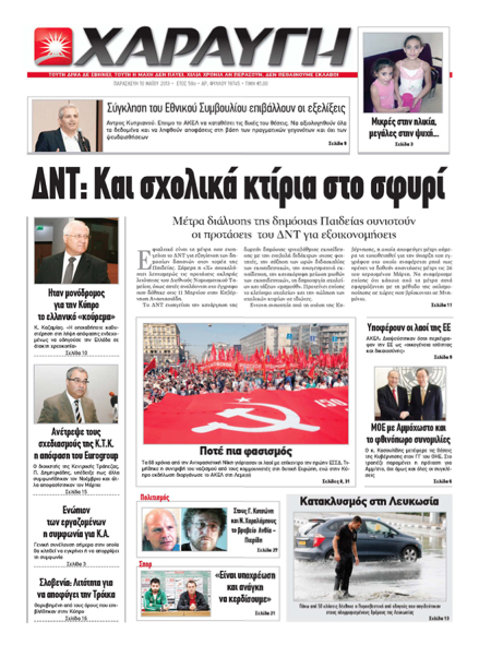 Η «Χαραυγή», τιτλοφορεί το κύριο θέμα της «ΔΝΤ: Και σχολικά κτίρια στο σφυρί», και γράφει ότι εφιαλτικά είναι τα μέτρα που εισηγείται το ΔΝΤ για εξυγίανση των δημοσίων δαπανών στον τομέα της Παιδείας. Προβάλλει επίσης δηλώσεις του ΓΓ του ΑΚΕΛ ότι το ΑΚΕΛ είναι έτοιμο να καταθέσει τις δικές του θέσεις και ζητά σύγκληση του Εθνικού Συμβουλίου αφού αυτό απαιτούν οι εξελίξεις. Σε άλλη στήλη γράφει ότι ο Υπουργός Εξωτερικών Ιωάννης Κασουλίδης μετέφερε τις θέσεις της κυβέρνησης στον ΓΓ του ΟΗΕ.