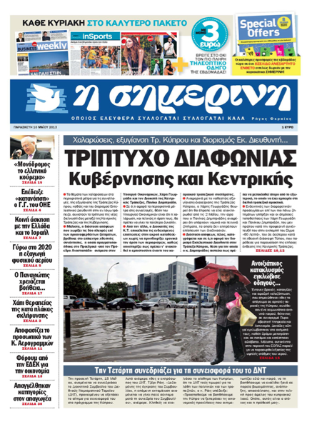 «Η Σημερινή», με κύριο τίτλο «Τρίπτυχο διαφωνίας Κυβέρνησης και Κεντρικής», γράφει ότι τα θέματα των χαλαρώσεων στα περιοριστικά μέτρα για τις συναλλαγές, την εξυγίανση της Τράπεζας Κύπρου καθώς και το διορισμό Εκτελεστικού Διευθυντή στην εν λόγω τράπεζα συνιστούν το τρίπτυχο της νέας διελκυστίνδας μεταξύ της ΚΤ και της Κυβέρνησης. Προβάλλει τον «ανοιξιάτικο κατακλυσμό» ο οποίος εγκλώβισε οδηγούς στα οχήματά τους αφού δρόμοι μετατράπηκαν σε ποτάμια. Σε άλλη στήλη γράφει ότι στις 15 Μαΐου το Διεθνές Νομισματικό Ταμείο θα συνεδριάσει για τη συνεισφορά του στο πρόγραμμα της Κύπρου.