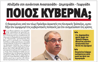Η αγγλόφωνη “Cyprus Mail”, κάτω από τον πρωτοσέλιδο τίτλο «Διοικητής ΚΤΚ: Δεν βλέπω λόγο να παραιτηθώ», γράφει ότι ο Πανίκος Δημητριάδης δήλωσε ότι δεν έχει πρόθεση να παραιτηθεί, ενώ η διαμάχη με την κυβέρνηση φαίνεται να συνεχίζεται αφού η κυβέρνηση δεν φαίνεται να είναι ευχαριστημένη με τον τρόπο με τον οποίο διαχειρίζεται την κρίση η ΚΤ. Γράφει επίσης ότι ξαφνική μπόρα στην πρωτεύουσα η οποία διήρκησε δύο ώρες πλημμύρισε υπόγεια ενώ οδηγοί παγιδεύτηκαν στα οχήματά τους. Προβάλλει επίσης διαμαρτυρία Κούρδων της Συρίας έξω από το Υπουργείο Εσωτερικών οι οποίοι ζητούν δικαίωμα να εργαστούν.