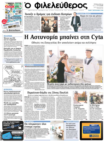 Ο «Φιλελεύθερος», υπό τον τίτλο «Η Αστυνομία μπαίνει στη Cyta», γράφει στο κύριο του θέμα ότι ραγδαίες αναμένεται να είναι οι εξελίξεις τα επόμενα 24ωρα στη Cyta, χωρίς να αποκλείονται και συλλήψεις στην πολύκροτη υπόθεση του τ/κ τεμαχίου στη Δρομολαξιά, καθώς η Νομική Υπηρεσία έδωσε χθες οδηγίες στον Αρχηγό Αστυνομίας να προχωρήσει σε ποινική έρευνα στη βάση των καταγγελιών του επιχειρηματία Χαράλαμπου Λιοτάτη. Αλλού, γράφει ότι με τη χθεσινή τροποποίηση του Συντάγματος που ψήφισε ομόφωνα η Βουλή, άνοιξε ο δρόμος για έκδοση Κυπρίων, με την υπόθεση του Ντίνου Μιχαηλίδη και του γιου του να επηρεάζονται άμεσα. Σε άλλο του θέμα γράφει ότι φεύγει με πρόωρη αφυπηρέτηση η διευθύντρια Μέσης Εκπαίδευσης Ζήνα Πουλλή.