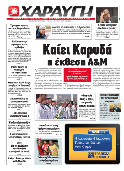 Η «Χαραυγή» στο κύριο της θέμα με τίτλο «Καίει Καρυδά η έκθεση Α&Μ» γράφει ότι το πόρισμα της Alvarez & Marsal περιλαμβάνει στοιχεία, τα οποία ενδεχομένως να στοιχειοθετούν ακόμη και ποινικές υποθέσεις εναντίον πρώην ανώτερων διευθυντών της Τράπεζας Κύπρου, μεταξύ των οποίων και ο Νικόλας Καρυδάς. Αλλού, γράφει ότι ο τέως Πρόεδρος της Δημοκρατίας Δημήτρης Χριστόφιας ενημέρωσε ήδη τον Πρόεδρο Αναστασιάδη ότι αρνείται να κάνει χρήση του δικαιώματος για παραχώρηση κρατικού αυτοκινήτου. Σε άλλο της θέμα, η εφημερίδα γράφει ότι από την 1η Αυγούστου αλλάζει το σύστημα ιατροφαρμακευτικής περίθαλψης.