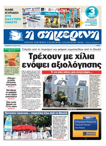 Η «Σημερινή» κάτω από τον τίτλο «Τρέχουν με χίλια ενόψει αξιολόγησης», γράφει στο κύριο της θέμα ότι με την ψήφιση χθες από τη Βουλή επτά ακόμη μνημονιακών νομοσχεδίων, η Κυβέρνηση θεωρεί πως έγινε ακόμα ένα βήμα για θετική αξιολόγηση από την Τρόικα, κλιμάκιο της οποίας φθάνει στην Κύπρο την προσεχή Τετάρτη. Αλλού, γράφει ότι η Πολιτεία και οι συγγενείς των 13 θυμάτων της τραγωδίας του Μαρί, απέτισαν χθες δόξα και τιμή στη μνήμη τους και ο Πρόεδρος της Δημοκρατίας τους εξέφρασε τη συγνώμη της Πολιτείας. Σε άλλο της θέμα και κάτω από σχετική φωτογραφία, γράφει για την εκδήλωση διαμαρτυρίας που πραγματοποίησαν χθες τα μέλη του Παγκύπριου Συνδέσμου Ιδιοκτητών Μέσων Θαλάσσιων Αθλημάτων-Ψυχαγωγίας έξω από τη Βουλή.