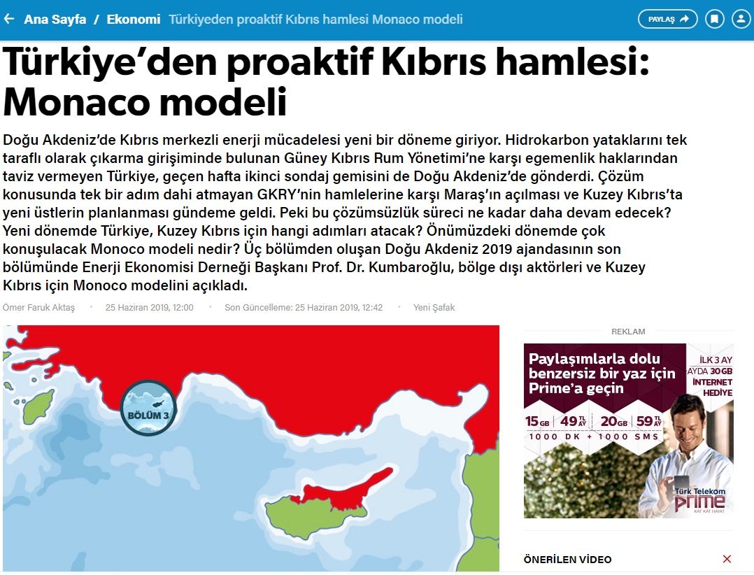 Αναθερμαίνονται τα σενάρια για προώθηση του μοντέλου «Μονακό» εκ μέρους της Τουρκίας σχετικά με την επόμενη μέρα του ψευδοκράτους, δεδομένου του αδιεξόδου στο Κυπριακό. Αφορμή της επαναφοράς του σχεδίου αυτού στον δημόσιο διάλογο είναι η τοποθέτηση του Πρόεδρου του Συλλόγου Οικονομικών Ενεργειών καθηγητή Gurkan Kumbaroğlu στο πλαίσιο της ατζέντας «Ανατολική Μεσόγειος 2019».