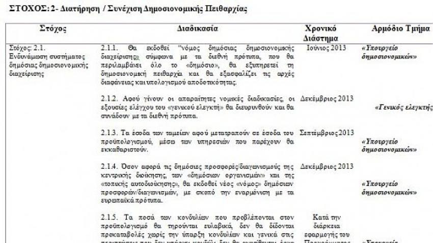 Οι προσλήψεις στο «δημόσιο» για κάθε έτος της χρονικής περιόδου εφαρμογής του προγράμματος δεν θα ξεπερνούν το 25% των συνταξιοδοτηθέντωνκατά τη χρονική περίοδο της εφαρμογής του οικονομικού προγράμματος 2010-2012, ενώ το εφάπαξ δεν θα ισχύει για πολύ και ο τρόπος υπολογισμού των συντάξεων θ’ αλλάξει με προφανή κατάληξη την διόρθωση προς τα κάτω του τελικού ποσού. Θα εισέλθουν διεθνή πρότυπα σε λογιστές και ελεγκτές, νομικές και διοικητικές ρυθμίσεις για την αποτροπή της απώλειας φόρων, ενώ οι αλλαγές στον τραπεζικό τομέα θα υποβοηθούν περισσότερο την ανάπτυξη εταιρειών και λιγότερο ατόμων ή ιδιωτών.