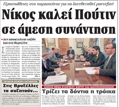 «Νίκος καλεί Πούτιν» ειναι ο τίτλος της σημερινής κυπριακής εφημερίδας Πολίτης. Η εφημερίδα αναφέρεται σε ταξίδι αστραπή στη Μόσχα που επιδιώκει ο Κύπριος πρόεδρος Νίκος Αναστασιάδης, έστω και για ανεπίσημη συνάντηση, με τον Ρώσο πρόεδρο Βλαντιμίρ Πούτιν.