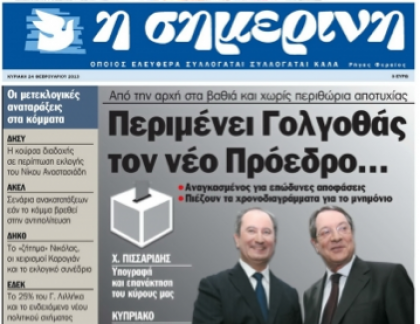 Η «Σημερινή», υπό τον τίτλο «Περιμένει Γολγοθάς τον νέο Πρόεδρο…», γράφει ότι ο νέος Πρόεδρος της Δημοκρατίας θα είναι αναγκασμένος να λάβει επώδυνες αποφάσεις και ότι πιέζουν τα χρονοδιαγράμματα για το μνημόνιο για διάσωση της κυπριακής οικονομίας. Επίσης, αναφέρεται στην υπόθεση απαγωγής του 18μηνου Σταύρου Στυλλή και γράφει ότι το κλειδί στην όλη υπόθεση είναι το κίνητρο και ότι η ύποπτη δεν είχε σχέση με την οικογένεια από το 2003, λόγω αντιπαράθεσης. Γράφει, επίσης, ότι στα μαύρα ντύθηκε η Αθηένου από τον αδόκητο χαμό του 13χρονου Κυριάκου Πάρπα, ο οποίος έχασε τις αισθήσεις του ενώ έκανε προπόνηση και, παρά τις προσπάθειες του προπονητή του για επανάκτηση των αισθήσεών του, το αγόρι δεν κατάφερε να επανέλθει.