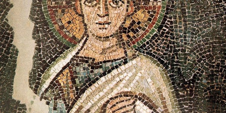 Η κεντρική αψίδα του ναού, που χρονολογείται στη Μέση Βυζαντινή περίοδο, ήταν διακοσμημένη με ψηφιδωτά από τον 6ο αι μ.Χ. και αποτελούν πολύ σημαντικά έργα τέχνης και από τα λιγοστά εναπομείναντα πρωτοχριστιανικά ψηφιδωτά παγκοσμίως. Σε αυτά εικονίζεται η Θεοτόκος ένθρονη περιβαλλόμενη από «φωτεινή δόξα», στοιχείο το οποίο συνήθως περιβάλλει τον Χρίστο στις σκηνές της Μεταμόρφωσης και της Ανάληψης. Η Θεοτόκος κρατά στα γόνατα της τον Χριστό. Τη δόξα πλαισίωναν δύο φοινικόδεντρα και δύο αρχάγγελοι με σκήπτρο. Την παράσταση περιέβαλλε πλατιά ζώνη με γεωμετρικό και φυτικό διάκοσμο και με δεκατρία μετάλλια, όπου εικονίζονταν στηθαίοι ο Χριστός ή σταυρός και οι δώδεκα απόστολοι.