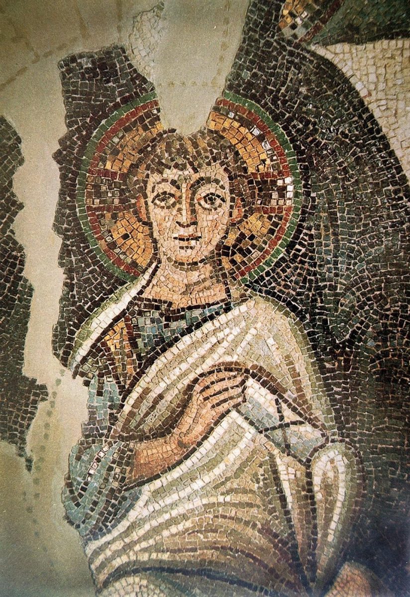 Η κεντρική αψίδα του ναού, που χρονολογείται στη Μέση Βυζαντινή περίοδο, ήταν διακοσμημένη με ψηφιδωτά από τον 6ο αι μ.Χ. και αποτελούν πολύ σημαντικά έργα τέχνης και από τα λιγοστά εναπομείναντα πρωτοχριστιανικά ψηφιδωτά παγκοσμίως. Σε αυτά εικονίζεται η Θεοτόκος ένθρονη περιβαλλόμενη από «φωτεινή δόξα», στοιχείο το οποίο συνήθως περιβάλλει τον Χρίστο στις σκηνές της Μεταμόρφωσης και της Ανάληψης. Η Θεοτόκος κρατά στα γόνατα της τον Χριστό. Τη δόξα πλαισίωναν δύο φοινικόδεντρα και δύο αρχάγγελοι με σκήπτρο. Την παράσταση περιέβαλλε πλατιά ζώνη με γεωμετρικό και φυτικό διάκοσμο και με δεκατρία μετάλλια, όπου εικονίζονταν στηθαίοι ο Χριστός ή σταυρός και οι δώδεκα απόστολοι.