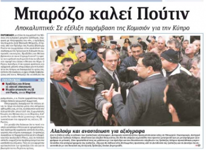 Ο «Φιλελεύθερος», υπό τον τίτλο «Μπαρόζο καλεί Πούτιν», γράφει ότι παρέμβαση με στόχο τη συμμετοχή της Μόσχας στο κυπριακό μνημόνιο εκδήλωσε, σύμφωνα με πληροφορίες τις εφημερίδας, ο Πρόεδρος της Ευρωπαϊκής Επιτροπής Ζοζέ Μανουέλ Μπαρόζο, ζητώντας από τον Πρόεδρο της Ρωσίας Βλαντιμίρ Πούτιν να συμμετάσχει στην υλοποίηση του σχεδιασμού της Τρόικας για τη διάσωση της κυπριακής οικονομίας. Γράφει, επίσης, ότι οι κάτοχοι τραπεζικών αξιόγραφων πραγματοποίησαν χθες δυναμικές κινητοποιήσεις σε Υπουργείο Οικονομικών, Κεντρική Τράπεζα και Τράπεζα Κύπρου. Επίσης, γράφει τεχνικός έλεγχος έκρινε ακατάλληλα 25 υπέργηρα λεωφορεία, τα οποία θα λειτουργούσαν από προχθές ως σχολικά.