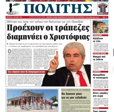 Ο Πολίτης στο πρωτοσέλιδο του σήμερα «Προέχουν οι τράπεζες διαμηνύει ο Χριστόφιας» . Μήνυμα και πρός την τρόικα στο διάγγελμα για την προεδρία.