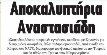 Η «Χαραυγή», στο κύριό της θέμα με τίτλο «Αποκαλυπτήρια Αναστασιάδη» αναφέρεται σε δημοσίευμα της «Χουριέτ» σύμφωνα με το οποίο ο Πρόεδρος του ΔΗΣΥ «δέχεται τουρκικές εγγυήσεις, ταυτίζεται με Ερντογάν για διευρυμένες συνομιλίες, θέλει χαλαρή ομοσπονδία, ζητά ένταξη της Κύπρου στον ΝΑΤΟ, διαμοιρασμό του φυσικού αερίου με την Τουρκία και θα ήθελε την τρόικα στην Κύπρο νωρίτερα». Επίσης, η «Χ» φιλοξενεί συνέντευξη της Υπουργού Εξωτερικών στην οποία δηλώνει ότι «οι Βρετανικές Βάσεις δεν είναι κυρίαρχο κράτος, είναι μια ανωμαλία» ενώ για τον κανονισμό για την Πράσινη Γραμμή τονίζει ότι πρέπει να εφαρμόζεται σωστά. Αλλού η εφημερίδα γράφει για την επιχείρηση της Αστυνομίας στη Λάρνακα που είχε ως αποτέλεσμα την καταγγελία 6 μουσικοχορευτικών κέντρων.
