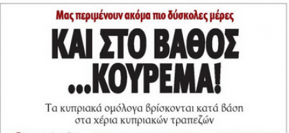 Η εβδομαδιαία «Καθημερινή της Κυριακής», υπό τον τίτλο «Νυστέρι και στις τράπεζες», γράφει ότι η υιοθέτηση του Μνημονίου και η εισροή των χρημάτων της Τρόικας δεν θα οδηγήσουν αυτόματα στην επίλυση των προβλημάτων του τραπεζικού τομέα και ότι χρήματα δεν πρόκειται να δοθούν σε μη βιώσιμες τράπεζες, οδηγώντας σε μετασχηματισμό το τραπεζικό σύστημα. Γράφει, επίσης, ότι δραστικές αλλαγές φέρνει στη ζωή των Κυπρίων το Μνημόνιο που συμφωνήθηκε κατ` αρχήν από την Κυβέρνηση και την Τρόικα. Επίσης, γράφει ότι η «επόμενη μέρα» της απόφασης του Eurogroup, που ανοίγει το δρόμο για την εκταμίευση των δόσεων προς την Αθήνα, δημιουργεί προσδοκίες αλλά και φόβους στο Μέγαρο Μαξίμου.