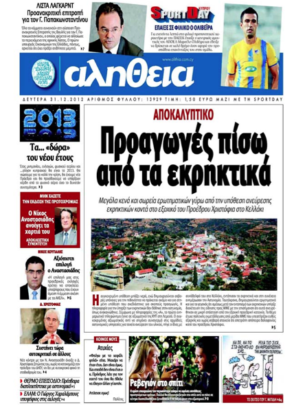 «Στο τσακ για καθολική απεργία πρατηριούχων» είναι ο κύριος τίτλος της αγγλόγλωσσης “Cyprus Mail” που αναφέρεται στην απεργία των πρατηριούχων στην ελεύθερη Αμμόχωστο και στις προειδοποιήσεις για παγκύπρια απεργία εάν δεν διαμορφωθούν οι όροι ανέγερσης πρατηρίων. Σε άλλο θέμα η εφημερίδα αναφέρεται στις δηλώσεις του Αρχιεπισκόπου για μη εκπροσώπηση της Κυβέρνησης στην πρωτοχρονιάτικη δοξολογία και στην απάντηση του Προέδρου. Επίσης προβάλλεται η συμφωνία στο Κογκρέσο προς αποφυγή του λεγόμενου δημοσιονομικού γκρεμού στις ΗΠΑ.