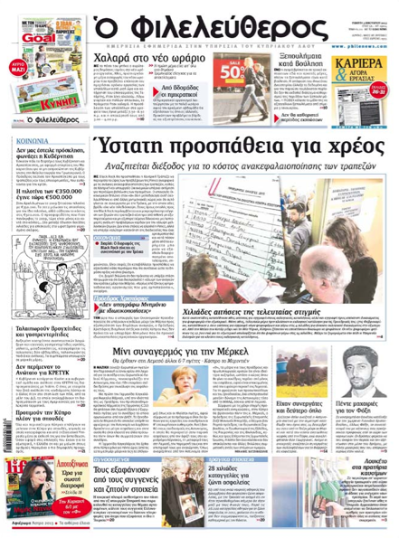 Με τίτλο «Ύστατη προσπάθεια για χρέος» ο «Φιλελεύθερος» γράφει ότι αναζητείται διέξοδος για το κόστος ανακεφαλαιοποίησης των τραπεζών και ότι η ΚΤ θα προσπαθήσει να περιορίσει το ύψος των προβλέψεων της Pimco με Black Rock.Aλλού ο «Φ» γράφει για την κάθοδο της Άγκελα Μέρκελ στη Λεμεσό για το συνέδριο του ΕΛΚ που οργανώνει ο ΔΗΣΥ και ότι η Αστυνομία έχει ετοιμάσει σχέδιο δράσης. Επίσης η εφημερίδα στην πρώτη της σελίδα αναφέρεται στην χθεσινή πρώτη ημέρα εφαρμογής του νέου ωραρίου στο Δημόσιο.
