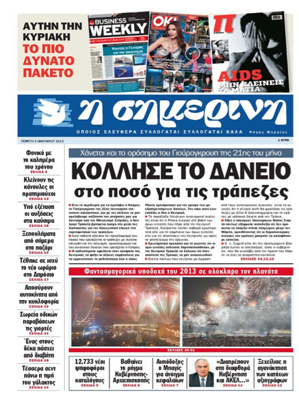 Η «Σημερινή» στεγάζει το κύριό της θέμα υπό τον τίτλο «Κόλλησε το δάνειο στο ποσό για τις τράπεζες». Σύμφωνα με το δημοσίευμα, ενώ στενεύουν τα περιθώρια για το Eurogroup της 21ης Ιανουαρίου, η ΚΤ βρίσκεται ακόμη στη μέση της διαδικασίας για τον διαγνωστικό έλεγχο στα χαρτοφυλάκια των τραπεζών. Αλλού η εφημερίδα κάνει αναφορά στο φονικό την Πρωτοχρονιά στη Λεμεσό και γράφει ότι πρόκειται μάλλον για ξεκαθάρισμα λογαριασμών για υποθέσεις ναρκωτικών. Επίσης στην «Σ» γίνεται πρωτοσέλιδη αναφορά στην απεργία των πρατηριούχων.