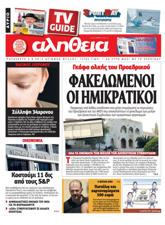 Η «Αλήθεια» υπό τον τίτλο «Φακελωμένοι οι Ημικρατικοί» γράφει ότι προφανώς από λάθος εστάλησαν στα μέσα ενημέρωσης οι σημειώσεις του Προεδρικού και του ΑΚΕΛ που αποκαλύπτουν φακέλωμα των μελών των Διοικητικών Συμβουλίων των ημικρατικών οργανισμών. Αλλού, γράφει ότι δεκάχρονο αγοράκι έπεσε θύμα βιασμού στη Λάρνακα το βράδυ της Τετάρτης από πωρωμένο πρόσωπο. Σε άλλο θέμα αναφέρεται στη νέα υποβάθμιση από τον «σκληρό» οίκο αξιολόγησης Standard & Poor’s, που ανεβάζει στα ύψη την πρόβλεψη για το μακροπρόθεσμο χρέος της Κύπρου.
