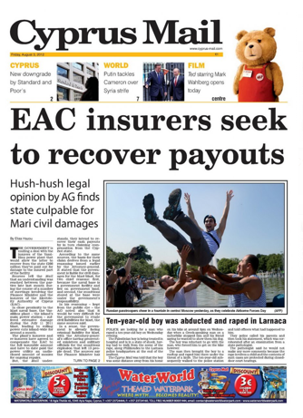 Με τίτλο “Οι ασφαλιστές της ΑΗΚ επιδιώκουν να ανακτήσουν όσα πλήρωσαν”, η αγγλόγλωσση εφημερίδα «Cyprus Mail» γράφει ότι η Κυβέρνηση εξετάζει ενδεχόμενη συμφωνία με τους ασφαλιστές του ηλεκτροπαραγωγικού σταθμού του Βασιλικού που θα επιτρέπει στους τελευταίους να ανακτήσουν από την Κυβέρνηση τα 200 εκατομμύρια που πλήρωσαν για τις ζημιές στο ασφαλισμένο μέρος των εγκαταστάσεων. Αλλού, γράφει για τη νέα υποβάθμιση της κυπριακής οικονομίας από τον οίκο Standard and Poor’s. Αλλού, αναφέρεται στο αποτρόπαιο έγκλημα της απαγωγής και του βιασμού του δεκάχρονου Παλαιστίνιου αγοριού στη Λάρνακα.