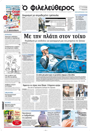 «Ο Φιλελεύθερος» υπό τον τίτλο «Με την πλάτη στον τοίχο» γράφει ότι η στριμωγμένη κυπριακή οικονομία δέχθηκε χθες κι άλλο πλήγμα με την υποβάθμιση από τον οίκο Standard & Poor’s, ο οποίος χτυπάει εκ νέου συναγερμό για τα μέτρα που θα έρθουν και η ανάλυσή του δίνει ιδιαίτερη βαρύτητα στα μέτρα της Τρόικας και στην ταχύτητα της διαπραγμάτευσης . Σε άλλο θέμα γράφει ότι, από υπερωρίες, 41 γιατροί της Πάφου μοιράστηκαν 1,2 εκατομμύρια ευρώ και πήραν από 23.000 μέχρι 25.000 ευρώ, ενώ 80 γιατροί της Λεμεσού μοιράστηκαν 1,4 δις ευρώ και πήραν από 18,000 ευρώ κατά μέσο όρο. Αλλού, γράφει ότι με τον αέρα του πρωτοπόρου και με αυτοπεποίθηση, συνεχίζει σήμερα την προσπάθειά του στους Ολυμπιακούς Αγώνες ο Παύλος Κοντίδης.