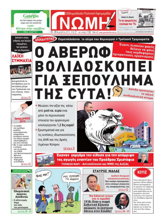 Η εβδομαδιαία εφημερίδα «Γνώμη» υπό τον τίτλο «Ο Αβέρωφ βολιδοσκοπεί για ξεπούλημα της Cyta » γράφει ότι o Αναπληρωτής Πρόεδρος του ΔΗΣΥ εκμεταλλεύεται το κλίμα που δημιουργεί η «τροϊκανή τρομοκρατία» και μειώνει την αξία της κάτω από μισό εκ. ευρώ, ενώ μόνο τα περιουσιακά στοιχεία του οργανισμού υπολογίζονται στο 1,2 δις ευρώ. Αλλού, γράφει ότι αντιπολίτευση και ΜΜΕ της Δεξιάς «έκαναν γαργάρα την είδηση για την απόρριψη αγωγής εναντίον του Προέδρου Χριστόφια». Σε άλλο θέμα αναφέρει ότι αισθητή είναι η δυναμικής πολυσυλλεκτικότητας Σταύρου Μαλά πριν ακόμα προχωρήσει στην επίσημη εξαγγελία της υποψηφιότητάς του.