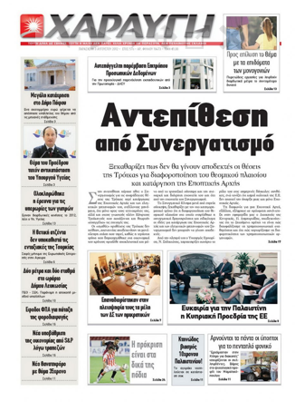 Η «Χαραυγή» υπό τον τίτλο «Αντεπίθεση από Συνεργατισμό», γράφει ότι ο Συνεργατισμός ξεκαθαρίζει πως δεν θα γίνουν αποδεκτές οι θέσεις της Τρόικας για διαφοροποίηση του θεσμικού πλαισίου και κατάργηση της Εποπτικής Αρχής. Σε άλλο θέμα αναφέρεται σε αυτεπάγγελτη παρέμβαση Επιτρόπου Προσωπικών Δεδομένων για την προεκλογική παρενόχληση εκπαιδευτικών από την Πρωτοπορία – ΔΗΣΥ. Αλλού, γράφει ότι ένα εκατομμύριο ευρώ φέρεται να απέσπασε υπάλληλος του Δήμου Πάφου από τις μηχανές στάθμευσης.