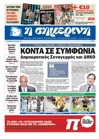«Η Σημερινή» υπό τον τίτλο «Κοντά σε συμφωνία ΔΗΣΥ και ΔΗΚΟ» γράφει ότι κύλησε αρκετό νερό στο αυλάκι της συνεργασίας ΔΗΣΥ-ΔΗΚΟ με στόχο τη στήριξη της υποψηφιότητας Νίκου Αναστασιάδη από τον πρώτο γύρο και τον σχηματισμό Κυβέρνησης Εθνικής Σωτηρίας και ότι ο Νίκος Αναστασιάδης δέχθηκε να δοθεί πρωταγωνιστικός ρόλος στο ΔΗΚΟ στη διαχείριση του Κυπριακού. Αλλού, γράφει ότι το κινητό του κατηγορούμενου για τον φόνο Αντη Χατζηκωστή, Ανδρέα Γρηγορίου Κασάπη αποκαλύπτει πολλά. Σε άλλο θέμα γράφει ότι οι χρήστες ναρκωτικών στην Κύπρο πέρασαν από την ηρωίνη στην πολυχρήση, σύμφωνα με στοιχεία του ΚΕΝΘΕΑ.