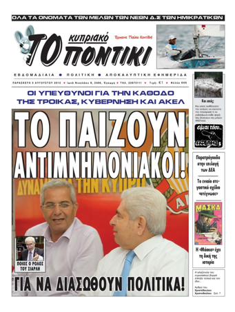Η εβδομαδιαία εφημερίδα «Το Κυπριακό Ποντίκι» υπό τον τίτλο «Το παίζουν αντιμνημονιακοί», γράφει ότι «οι υπεύθυνοι για την κάθοδο της Τρόικας, Κυβέρνηση και ΑΚΕΛ ξεκίνησαν αντιμνημονιακό αγώνα για να διασωθούν πολιτικά». Αλλού, η εφημερίδα αναφέρεται σε παρατράγουδα στην Επιλογή των Δοκίμων Εφέδρων Αξιωματικών. Σε άλλο θέμα, το Ποντίκι γράφει ότι το ενιαίο στεγαστικό σχέδιο «στέγνωσε».