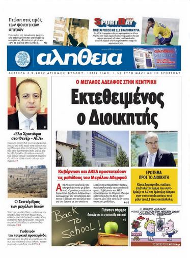 Η «Αλήθεια» στεγάζει το κύριό της θέμα υπό τον τίτλο «Εκτεθειμένος ο Διοικητής» και αναφέρεται σε ‘Μεγάλο Αδελφό’ τον οποίο όπως γράφει προστατεύουν κυβέρνηση και ΑΚΕΛ στο θέμα της εγκυκλίου για παράδοση κινητών τηλεφώνων και ηλεκτρονικών υπολογιστών. Αλλού η «Α» αναφέρεται στις δηλώσεις του επικεφαλής των ενταξιακών διαπραγματεύσεων Αγκυρας-ΕΕ Εγκεμέν Μπαγίς με αφορμή την κλήρωση της ΑΕΛ με την Φενέρ Μπαχτσέ για το Γιουρόπα Λιγκ. με τις οποίες καλεί τον Πρόεδρο Χριστόφια να πάει στην Κωνσταντινούπολη μαζί με τον Ντερβίς Ερογλου. Επίσης αναφέρει ότι το Σεπτέμβριο θα υπάρξουν σημαντικές εξελίξεις σε τέσσερις δίκες, αυτές του Μαρί, της Ηλιος, του πενταπλού φονικού στην Αγία Νάπα και για τη δολοφονία του Αντη Χ’Κωστή.