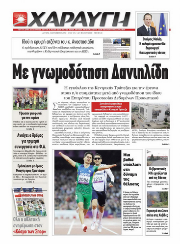 Η «Χαραυγή» στεγάζει το κύριο της θέμα υπό τον τίτλο «Με γνωμοδότηση Δανιηλίδη» και γράφει ότι η εγκύκλιος της Κεντρικής τράπεζας για την έρευνα σε υπολογιστές και κινητά ετοιμάστηκε έπειτα από γνωμοδότηση του Επιτρόπου Προστασίας Προσωπικών Δεδομένων. ενώ αναφορά γίνεται και στην ανακοίνωση της Κεντρικής περί προσπάθειας αποπροσανατολισμού. Αλλού αναφέρεται σε ΄κρυφή’ ατζέντα του Προέδρου του ΔΗΣΥ και υποψήφιου για την προεδρία της Δημοκρατίας Νίκου Αναστασιάδη και προβάλλει τις δηλώσεις ΑΚΕΛ και Κυβέρνησης με αφορμή την αντιπαράθεση για φερόμενες δηλώσεις του Προέδρου του ΔΗΣΥ που προβάλλει η Χουριέτ. Επίσης προβάλλονται αναφορές του υποψήφιο για την προεδρία της Δημοκρατίας, Υπουργού Υγείας Σταύρου Μαλά ότι η χαλαρή ομοσπονδία δημιουργεί διαχωριστικές τάσεις.