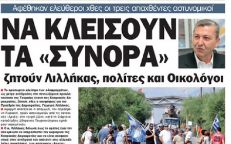 «Να κλείσουν τα ‘σύνορα’ ζητούν Λιλλήκας, πολίτες και Οικολόγοι», τιτλοφορεί το κύριο θέμα της η «Σημερινή», αναφερόμενη στο αίτημα του υποψηφίου για την Προεδρία της Δημοκρατίας Γιώργου Λιλλήκα για προσωρινό κλείσιμο των οδοφραγμάτων, με αφορμή την απαγωγή των τριών αστυνομικών από τις κατοχικές «αρχές». Αναφέρεται επίσης στη διαμαρτυρία ομάδας πολιτών που προσπάθησαν να κλείσουν το οδόφραγμα του Αγ. Δωματίου, με παρότρυνση του πρώην Ευρωβουλευτή Μάριου Ματσάκη. Σε άλλο θέμα, η εφημερίδα γράφει ότι κλειδώνουν απόψε στο Υπουργικό Συμβούλιο οι αντιπροτάσεις της Κυβέρνησης προς την Τρόικα. Επίσης, γράφει ότι οι εργοδοτικές οργανώσεις απορρίπτουν τη μεσολαβητική πρόταση της Υπουργού Εργασίας για την ΑΤΑ.