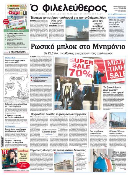 Ο «Φιλελεύθερος» γράφει για «Ρωσικό μπλόκο στο Μνημόνιο» στον πρωτοσέλιδο τίτλο του, προσθέτοντας ότι το ρωσικό δάνειο που συνήψε η Κύπρος του 2011 και λήγει το 2016, φαίνεται να αναδεικνύεται σε σκόπελο, καθώς χώρες στην Ευρωζώνη με κανέναν τρόπο δεν δέχονται να αναχρηματοδοτηθεί μέσα από το κυπριακό Μνημόνιο. Ακόμη αναφέρει ότι στη Κεντρική εκτιμούν ότι αν συμφωνηθεί επιμήκυνση του χρόνου αποπληρωμής με τη Μόσχα, αυτό θα διευκολύνει τη σύναψη συμφωνίας επί του μνημονίου. Εξάλλου, ο «Φ» αναφέρεται σε τέσσερεις μνηστήρες-κολοσσούς για την ενδιάμεση λύση της διάθεσης φυσικού αερίου στην Κύπρο μέχρι το 2018.