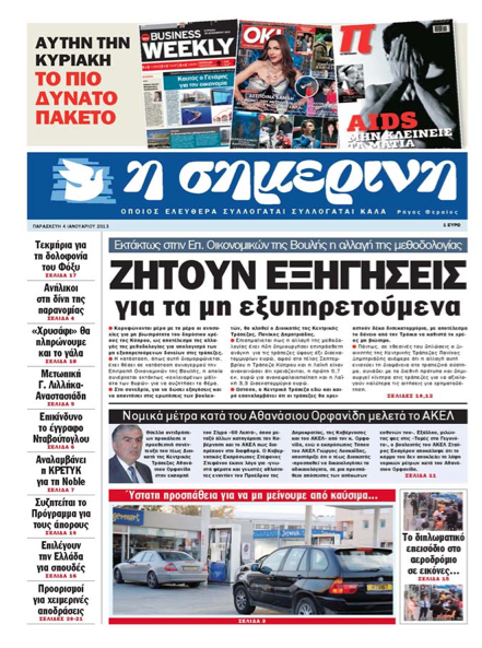 Η «Σημερινή», υπό τον τίτλο «ζητούν εξηγήσεις για τα μη εξυπηρετούμενα», γράφει ότι μέρα με την ημέρα κορυφώνονται οι ανησυχίες για μη βιωσιμότητα του δημόσιου χρέους ως αποτέλεσμα της αλλαγής της μεθοδολογίας για τον υπολογισμό των μη εξυπηρετούμενων δανείων και προσθέτει ότι η Επιτροπή Οικονομικών της Βουλής συνέρχεται εκτάκτως για να συζητήσει το θέμα. Ακόμη γράφει ότι το ΑΚΕΛ μελετά τη λήψη νομικών μέτρων κατά του τέως Διοικητή της Κεντρικής Αθανάσιου Ορφανίδη μετά την προχθεσινή συνέντευξή του. Ακόμη, η «Σ» αναφέρει ότι η ΚΡΕΤΥΚ αναλαμβάνει τις διαπραγματεύσεις με την εταιρεία Noble.