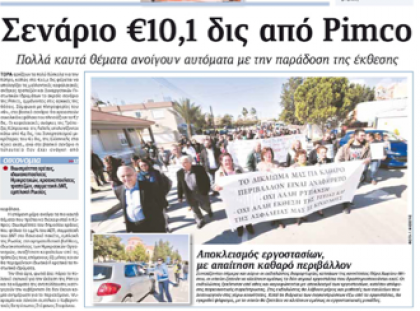 Ο «Φιλελεύθερος», υπό τον τίτλο «Σενάριο €10,1 δις από Pimco», γράφει ότι τώρα αρχίζουν τα πολύ δύσκολα για την Κύπρο, καθώς στα €10,1 δισεκατομμύρια ευρώ φέρεται να υπολογίζει τις μελλοντικές κεφαλαιακές ανάγκες τραπεζών και συνεργατικών πιστωτικών ιδρυμάτων το ακραίο σενάριο της Pimco, εμμένοντας στις αρχικές της θέσεις. Γράφει, επίσης, ότι συνεχίζονται σήμερα και αύριο οι εκδηλώσεις διαμαρτυρίας κατοίκων της κοινότητας Πέρα Χωρίου – Νήσου, οι οποίοι ζητούν να κλείσουν αμέσως τα δύο χημικά εργοστάσια που δραστηριοποιούνται εκεί. Επίσης, γράφει ότι απαιτήθηκαν 40 χρόνια από την ίδρυση της Κυπριακής Δημοκρατίας για να βρεθεί τρόπος να διαγράφονται οι νεκροί από τους εκλογικούς καταλόγους.