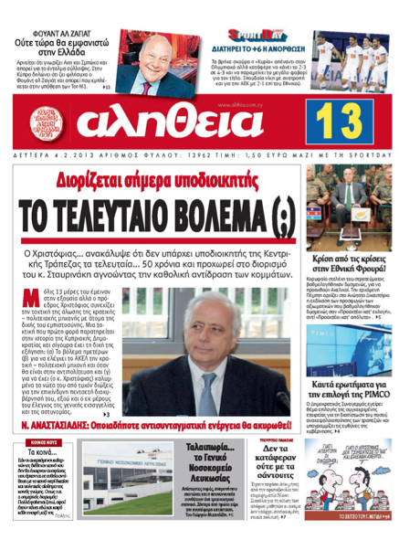 Η «Αλήθεια», υπό τον τίτλο «Το τελευταίο βόλεμα (;)», αναφέρεται στον διορισμό του Σπύρου Σταυρινάκη στη θέση του Υποδιοικητή της Κεντρικής Τράπεζας και γράφει ότι, μόλις 13 ημέρες του έμειναν στην εξουσία, αλλά ο Πρόεδρος Χριστόφιας συνεχίζει την τακτική της άλωσης της κρατικής-πολιτειακής μηχανής με άτομα της δικής του εμπιστοσύνης. Γράφει, επίσης, ότι κορυφαία στελέχη του στρατεύματος βαθμολογήθηκαν δυσμενώς, για να παραχθούν ΑΚΕΛικοί, και την ερχόμενη Πέμπτη αρχίζει στο Ανώτατο Δικαστήριο η εκδίκαση των προσφυγών των αξιωματικών που βαθμολογήθηκαν δυσμενώς. Επίσης, γράφει ότι απίστευτες ουρές, αναμονή και ασυνεννοησία συνθέτουν ένα τριτοκοσμικό σκηνικό στο Γενικό Νοσοκομείο Λευκωσίας.