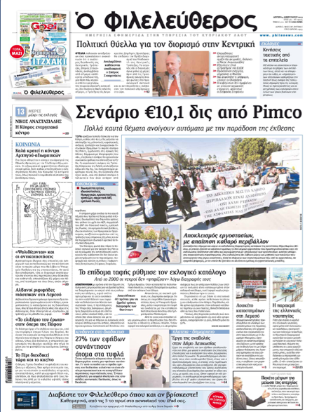 Ο «Φιλελεύθερος», υπό τον τίτλο «Σενάριο €10,1 δις από Pimco», γράφει ότι τώρα αρχίζουν τα πολύ δύσκολα για την Κύπρο, καθώς στα €10,1 δισεκατομμύρια ευρώ φέρεται να υπολογίζει τις μελλοντικές κεφαλαιακές ανάγκες τραπεζών και συνεργατικών πιστωτικών ιδρυμάτων το ακραίο σενάριο της Pimco, εμμένοντας στις αρχικές της θέσεις. Γράφει, επίσης, ότι συνεχίζονται σήμερα και αύριο οι εκδηλώσεις διαμαρτυρίας κατοίκων της κοινότητας Πέρα Χωρίου – Νήσου, οι οποίοι ζητούν να κλείσουν αμέσως τα δύο χημικά εργοστάσια που δραστηριοποιούνται εκεί. Επίσης, γράφει ότι απαιτήθηκαν 40 χρόνια από την ίδρυση της Κυπριακής Δημοκρατίας για να βρεθεί τρόπος να διαγράφονται οι νεκροί από τους εκλογικούς καταλόγους.