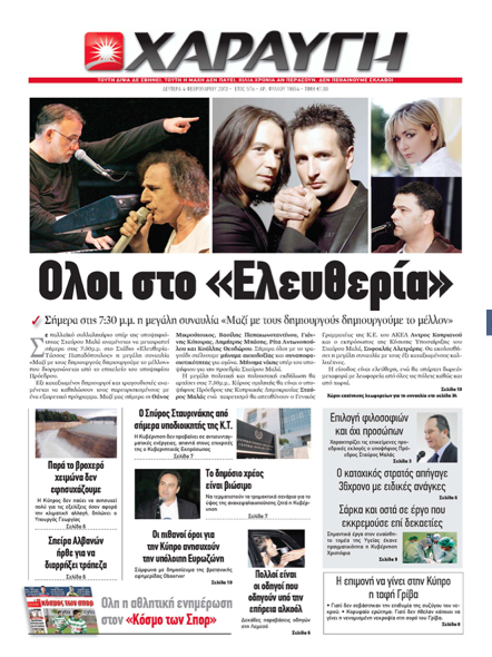 Η «Χαραυγή», υπό τον τίτλο «Όλοι στο ‘Ελευθερία’ «, γράφει ότι σε παλλαϊκό συλλαλητήριο υπέρ της υποψηφιότητας του Σταύρου Μαλά αναμένεται να μετατραπεί σήμερα στο στάδιο «Ελευθερία – Τάσσος Παπαδόπουλος» η συναυλία που διοργανώνεται από το επιτελείο του υποψήφιου. Γράφει, επίσης, ότι καθήκοντα Υποδιοικητή της Κεντρικής Τράπεζας αναλαμβάνει από σήμερα ο Σπύρος Σταυρινάκης και ότι ο Κυβερνητικός Εκπρόσωπος Στέφανος Στεφάνου δήλωσε ότι η Κυβέρνηση δεν προβαίνει σε αντισυνταγματικές ενέργειες. Επίσης, αναφέρεται σε δήλωση του Υπουργού Γεωργίας, Φυσικών Πόρων και Περιβάλλοντος Σοφοκλή Αλετράρη ότι η Κύπρος δεν παύει να ανησυχεί πολύ για τις εξελίξεις όσον αφορά την κλιματική αλλαγή.