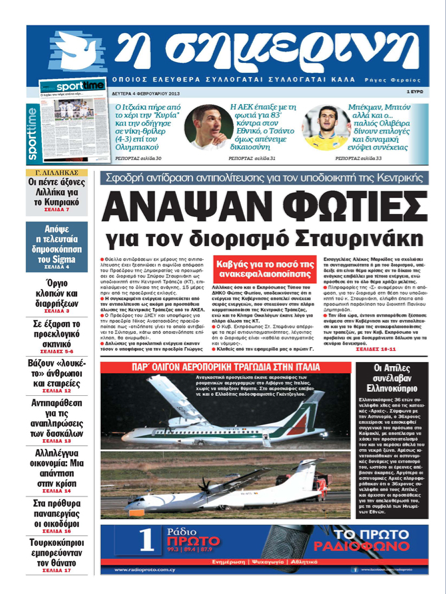 Η «Σημερινή», υπό τον τίτλο «Άναψαν φωτιές για τον διορισμό Σταυρινάκη», γράφει ότι θύελλα αντιδράσεων εκ μέρους της αντιπολίτευσης έχει ξεσηκώσει η αιφνίδια απόφαση του Προέδρου Χριστόφια να προχωρήσει σε διορισμό του Σπύρου Σταυρινάκη ως Υποδιοικητή της Κεντρικής Τράπεζας, επικαλούμενος το δίκαιο της ανάγκης. Γράφει, επίσης, ότι 36χρονος Ελληνοκύπριος συνελήφθη χθες από τις κατοχικές «αρχές», όταν επιχείρησε να επισκεφθεί συγγενικά του πρόσωπα στο Καϊμακλί, με αποτέλεσμα να χάσει τον προσανατολισμό του. Επίσης, γράφει ότι αεροσκάφος των ρουμανικών αερογραμμών, στο οποίο επέβαινε και ο Ελλαδίτης ποδοσφαιριστής Γκεντζόγλου, έκανε αναγκαστική προσγείωση στην Ιταλία, χωρίς να υπάρξουν θύματα.