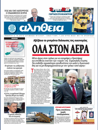Η «Αλήθεια» στο κύριο της θέμα με τίτλο «Όλα στον αέρα» αναφέρει πως θέτει όρους στην Τρόικα για να υπογράψει ο Πρόεδρος Χριστόφιας και επιτίθεται εναντίον των «ταγών» της Ευρωπαϊκής Ενωσης. Αλλού σημειώνει πως ο Πρόεδρος των Κυπριακών Αερογραμμών θέλει αν προχωρήσει από τώρα σε απολύσεις υπαλλήλων, αφήνοντας ανοικτό το θέμα της αποζημίωσής τους. Εξάλλου αναφέρει πως ο Αρχηγός της Αστυνομίας έθεσε σε διαθεσιμότητα δυο αστυνομικούς μια ημέρα πριν αποφασίσει το Ανώτατο Δικαστήριο.
