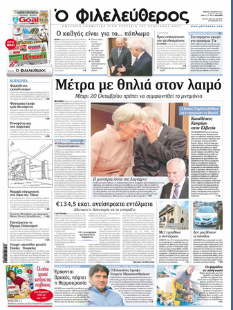 «Ο Φιλελεύθερος» γράφει στο κύριο του θέμα με τίτλο «Μέτρα με θηλιά στον λαιμό» ότι με βασικό άξονα την επιμήκυνση του χρόνου αναδιάρθρωσης των δημόσιων οικονομικών μέχρι το 2016, το Υπουργικό Συμβούλιο ασχολήθηκε χθες βράδυ, σε πολύωρη συνεδρία, με το πακέτο μέτρων που η Κυβέρνηση θα καταθέσει στην Τρόικα. Σε άλλο θέμα αναφέρει πως την ενημέρωση της Βουλής για τις καταθέσεις που διατηρούν Κύπριοι σε ελβετικές τράπεζες ζήτησε ο βουλευτής Γιώργος Περδίκης από τον Υπουργό Οικονομικών Βάσο Σιαρλή. Αλλού κάνει λόγο για άγρια κόντρα ΔΗΚΟ-ΕΔΕΚ για το ναυάγιο της προσπάθειας συμπόρευσης στις προεδρικές εκλογές με κοινό υποψήφιο του ενδιάμεσου χώρου.