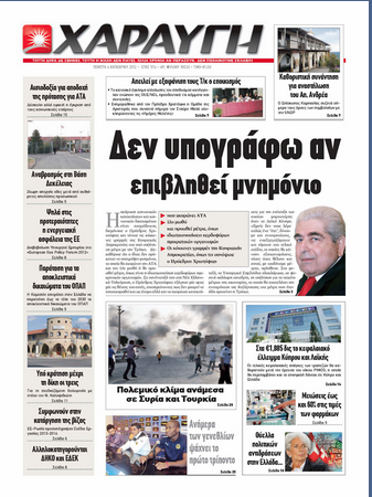 Η «Χαραυγή» στο κύριο της θέμα με τίτλο «Δεν υπογράφω αν επιβληθεί μνημόνιο» αναφέρει πως ο Πρόεδρος Χριστόφιας διαμήνυσε ότι η ακύρωση κοινωνικών κατακτήσεων και κοινωνικών δικαιωμάτων είναι απαράδεκτη και τόνισε τις κόκκινες γραμμές της Κυπριακής Δημοκρατίας στα υπό συζήτηση μέτρα με την Τρόικα. Σε άλλο θέμα σημειώνει πως ο Επίσκοπος Καρπασίας συζητά σήμερα τους όρους των συμβολαίων με την UNDP για το θέμα της αναστήλωσης του Αποστόλου Ανδρέα. Αλλού αναφέρεται σε μειώσεις έως και 60% στις τιμές των φαρμάκων.