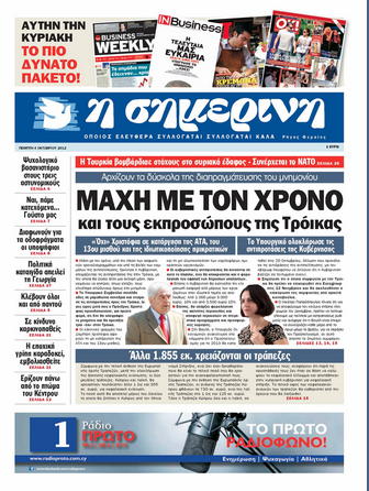 «Η Σημερινή» με κύριο τίτλο «Μάχη με τον χρόνο και τους εκπροσώπους της Τρόικας» αναφέρει πως μάχη με το χρόνο, υπό την πίεση των ασφυκτικών χρονοδιαγραμμάτων και υπό τις βολές των κομμάτων της αντιπολίτευσης ξεκίνησε η Κυβέρνηση, ετοιμάζοντας τις αντιπροτάσεις της στην Τρόικα, με την οποία θα δώσει άλλη μια σκληρή μάχη. Αλλού αναφέρει πως άλλα 1.855 εκ. χρειάζονται οι τράπεζες, σύμφωνα με την τελική έκθεση της Ευρωπαϊκής Αρχής Τραπεζών. Εξάλλου αναφέρει πως διαφωνούν για το θέμα των οδοφραγμάτων οι υποψήφιοι για την Προεδρία της Δημοκρατίας.