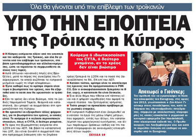 H “Σημερινή» στεγάζει το κύριό της θέμα υπό τον τίτλο «Υπό την εποπτεία της Τρόικας η Κύπρος» και γράφει ότι όλα πλέον θα γίνονται υπό την επίβλεψη των τροϊκανών στη βάση χρονοδιαγραμμάτων και όπως αναφέρθηκε στο χθεσινό Eurogroup το κρίσιμο σημείο είναι η βιωσιμότητα του χρέους που θα εξαρτηθεί από το ποσό της ανακεφαλαιοποίησης.Σε άλλο θέμα η «Σ» αναφέρεται σε δημοσκόπηση του «Σίγμα» με βάση την οποία ο Γιώργος Λιλλήκας έχει οριακό προβάδισμα έναντι του Σταύρου Μαλά ενώ χαμηλές είναι οι συσπειρώσεις ΑΚΕΛ και ΔΗΚΟ. Επίσης η εφημερίδα προβάλλει πρωτοσέλιδα την απεργία των οδηγών λεωφορείων και τις δηλώσεις του Υπουργού Συγκοινωνιών.