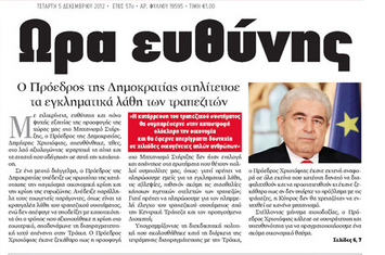 Η «Χαραυγή», στο κύριο της θέμα με τίτλο «Ώρα ευθύνης», αναφέρεται στο χθεσινό διάγγελμα του Προέδρου Χριστόφια, σημειώνοντας ότι ο Πρόεδρος Χριστόφιας με ειλικρίνεια, ευθύτητα και πόνο ψυχής, εξαιτίας της προσφυγής της χώρας στον Μηχανισμό Στήριξης, απευθύνθηκε στο λαό, αξιολογώντας ιεραρχικά τα αίτια και τα αιτιατά που οδήγησαν σε αυτήν την κατάσταση. Αλλού γράφει ότι η Κύπρος βρίσκεται στη μέση της διαμάχης μεταξύ Ευρώπης και ΔΝΤ για το θέμα της απευθείας ανακεφαλαιοποίησης των τραπεζών από τον Ευρωπαϊκό Μηχανισμό Σταθερότητας. Αλλού αναφέρει ότι με νέες απεργίες προειδοποιούν οι οικοδόμοι.