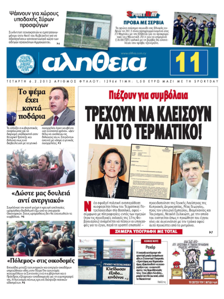 Η «Αλήθεια» γράφει στο κύριο της θέμα, με τίτλο «Τρέχουν να κλείσουν και το τερματικό!» ότι νέα σφοδρή αντιπαράθεση κυοφορείται λόγω του τερματικού πετρελαιοειδών στο Βασιλικό, καθώς αναμένεται να πέσουν οι υπογραφές για το έργο πριν τις προεδρικές εκλογές και παρά την προειδοποίηση της Γενικής Λογίστριας στον Υπουργό Εμπορίου ότι το έργο πρέπει να γίνει σε συνεννόηση με την τρόικα. Αλλού, γράφει ότι ο Κυβερνητικός Εκπρόσωπος τα αλλάζει για το διορισμό του Υποδιοικητή της Κεντρικής Τράπεζας και δηλώνει πως αντί για διαβούλευση με τον Γενικό Εισαγγελέα, έγινε κουβέντα σε ‘ανύποπτο’ χρόνο. Εξάλλου, αναφέρεται στην κραυγή αγωνίας ωρομίσθιου κατά την διαδήλωση χθες έξω από το Υπουργείο Οικονομικών.