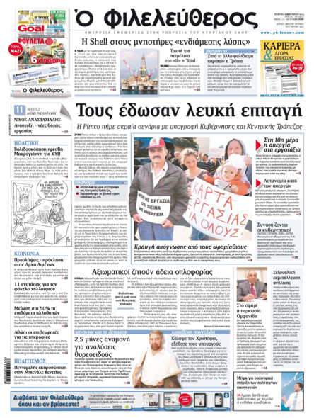 «Τους έδωσαν λευκή επιταγή» τιτλοφορεί το πρωτοσέλιδο θέμα του ο «Φιλελεύθερος» και γράφει ότι στην PIMCO ανήκει ο τελευταίος λόγος αναφορικά με το τελικό αποτέλεσμα για το ποσό ανακεφαλαιοποίησης του χρηματοπιστωτικού συστήματος, την ίδια στιγμή όμως φαίνεται ότι οι υψηλές εκτιμήσεις βασίζονται εν πολλοίς και στα μακροοικονομικά σενάρια που δόθηκαν από τη Συντονιστική Επιτροπή, με την υπογραφή Κυβέρνησης και Κεντρικής Τράπεζας. Ακόμη γράφει ότι σήμερα πέφτουν οι υπογραφές των συμβολαίων με την Total για τα θαλάσσια οικόπεδα 10 και 11. Επίσης γράφει ότι ο Πρέσβης Μαυρογιάννης βολιδοσκοπήθηκε δύο φορές για να αναλάβει πολιτικός προϊστάμενος της ΚΥΠ, ενδεχόμενο στο οποίο δεν ήταν θετικός.