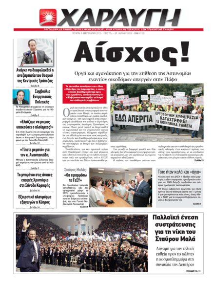 Η «Χαραυγή» με τίτλο «Αίσχος!» γράφει στο κύριο της θέμα για οργή και αγανάκτηση για την επίθεση της Αστυνομίας εναντίον των οικοδόμων απεργών στην Πάφο, ενώ συμπληρώνει ότι τα επεισόδια καταδίκασε και ο Πρόεδρος της Δημοκρατίας, στέλνοντας παράλληλα μήνυμα στους εργοδότες ότι η Κυβέρνηση υποστηρίζει το θεσμό των συλλογικών συμβάσεων. Επίσης, αναφέρει ότι το Υπουργικό Συμβούλιο αποφάσισε τη σύσταση Συμβουλίου Ενεργειακής Πολιτικής που θα αποτελεί συμβουλευτικό Σώμα για τα θέματα ενέργειας. Ακόμη, γράφει για παλλαϊκή ένεση συστράτευσης για τη νίκη του Σταύρου Μαλά, το βράδυ της Δευτέρας στο «Ελευθερία».